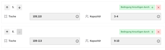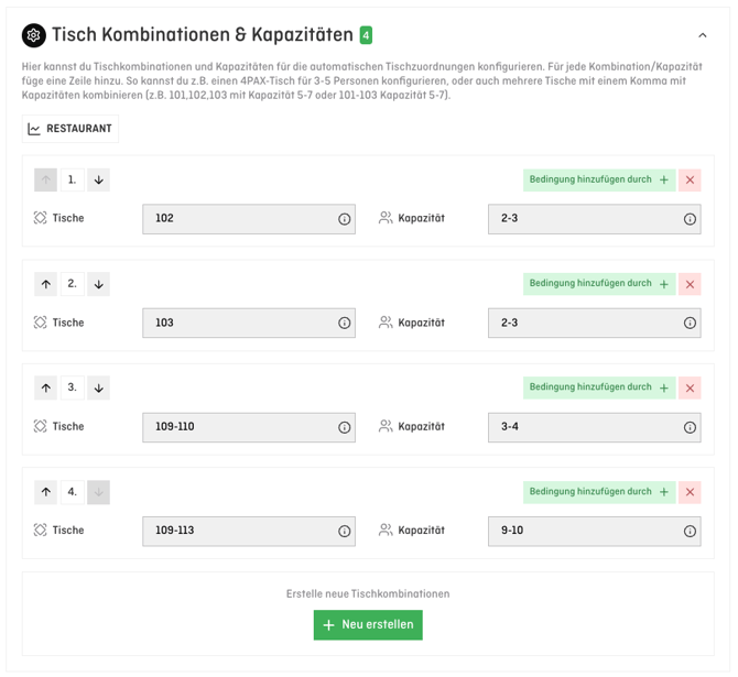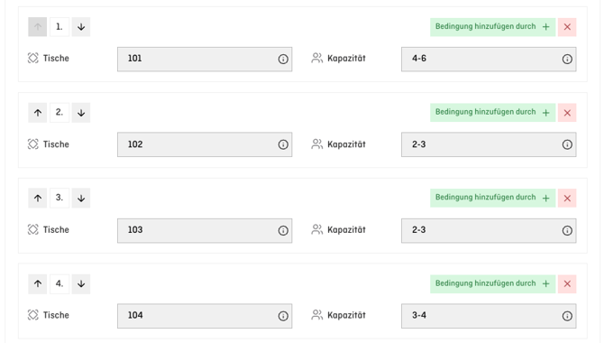 💡 Tipp: Für den Start empfehlen wir, die grundsätzlichen Tischkapazitäten und meistgenutzten Kombinationen einmalig zu konfigurieren. Bedingungen (z.B. Zeitfenster) brauchst du nur, wenn du sie wirklich nutzt.