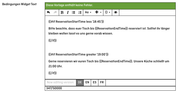 Hinweistexte hierzu können auch in if-Bedingungen eingebaut werden, sodass für unterschiedliche Buchungszeiten eigene Hinweistexte angezeigt werden.