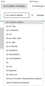 - Bestimmter Zeitbereich (z.B. 10.12.24 - 24.12.24.) -> "ist im Bereich" auswählen