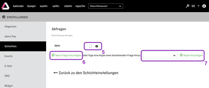 Nun kannst du die Zusatzabfrage im Reservierungs-Widget aktivieren oder deaktivieren (5), neue Fragen hinzufügen (6) oder eine bereits vorhanden Abfrage z.B. aus einer anderen Schicht übernehmen (7): Wähle hierzu aus dem Pull-Down-Menu eine der bereits vorhanden Fragen aus und füge sie dieser Schicht durch den Klick auf "Kopie hinzufügen" hinzu.