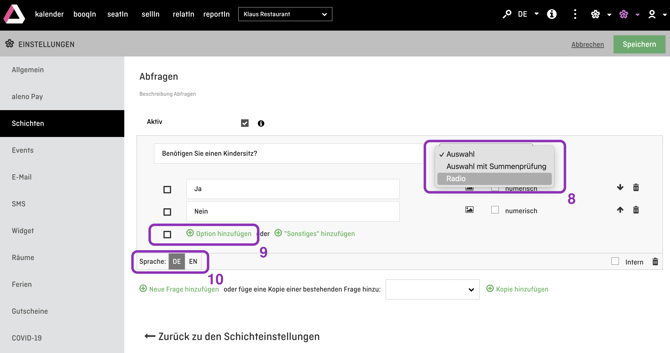 Beachte: Wenn du deinen Gästen die Online-Reservierung in mehreren Sprachen anbietest, dann musst die Zusatzfrage in jeder angebotenen Sprache ausfüllen. Zwischen den Sprachvarianten kannst du unter den Antwortoptionen wechseln und die Frage übersetzen (10).