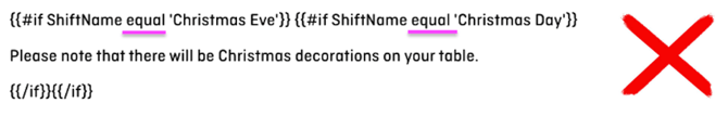 | {{#if var1 equal var2}}exampleText{{/if}} | if A = 'X' – Text Beispiel |