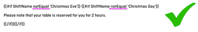 Oder aber kannst du auch die if-Anweisung in deinen Bedingungen (in den Schichteinstellungen) einsetzen, damit z.B. Gäste bei einer frühen Reservierungszeit darauf hingewiesen werden, dass sie ihren Tisch wieder freigeben müssen.