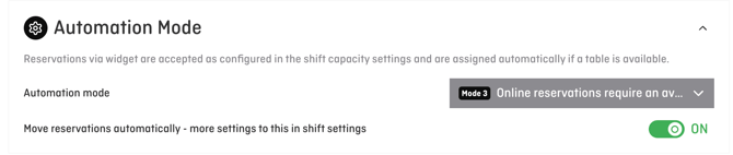 Mode 2: The system assigns tables to reservations automatically, if available. Online availability in the booking widget is calculated solely based on the configured capacities in the shift settings.