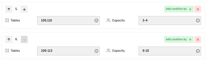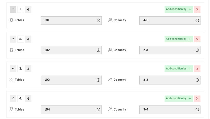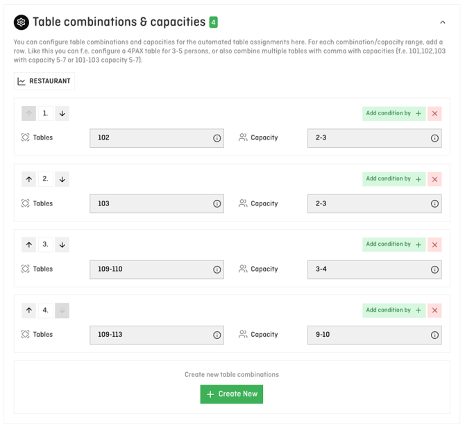 💡 Tip: For getting started, we recommend configuring the basic table capacities and the most commonly used combinations once. Conditions (e.g. time windows) are only needed if you actively use them.