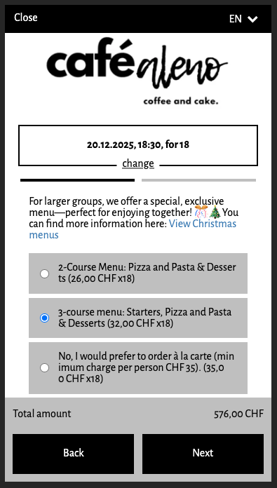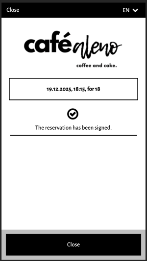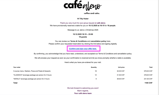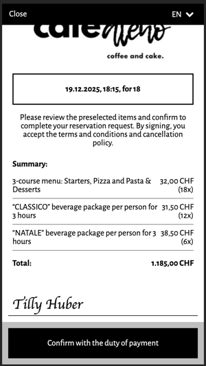 A guest books a Christmas dinner for ten people. During the booking process, they select menu option 1 or 2m submit their provisional reservation request via the widget. An automatically sent email will then ask them to confirm their pre-order with a digital signature.