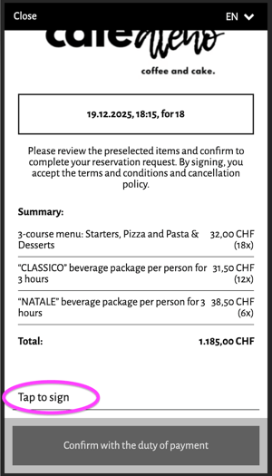 In this article, you’ll learn how to let your guests digitally confirm and sign pre-orders, menu selections, or binding reservations.